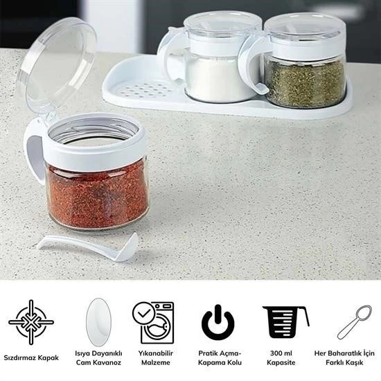 Набор из 3-х стеклянных герметичных банок для специй белого цвета с подставкой, крышкой и ложкой KC-386