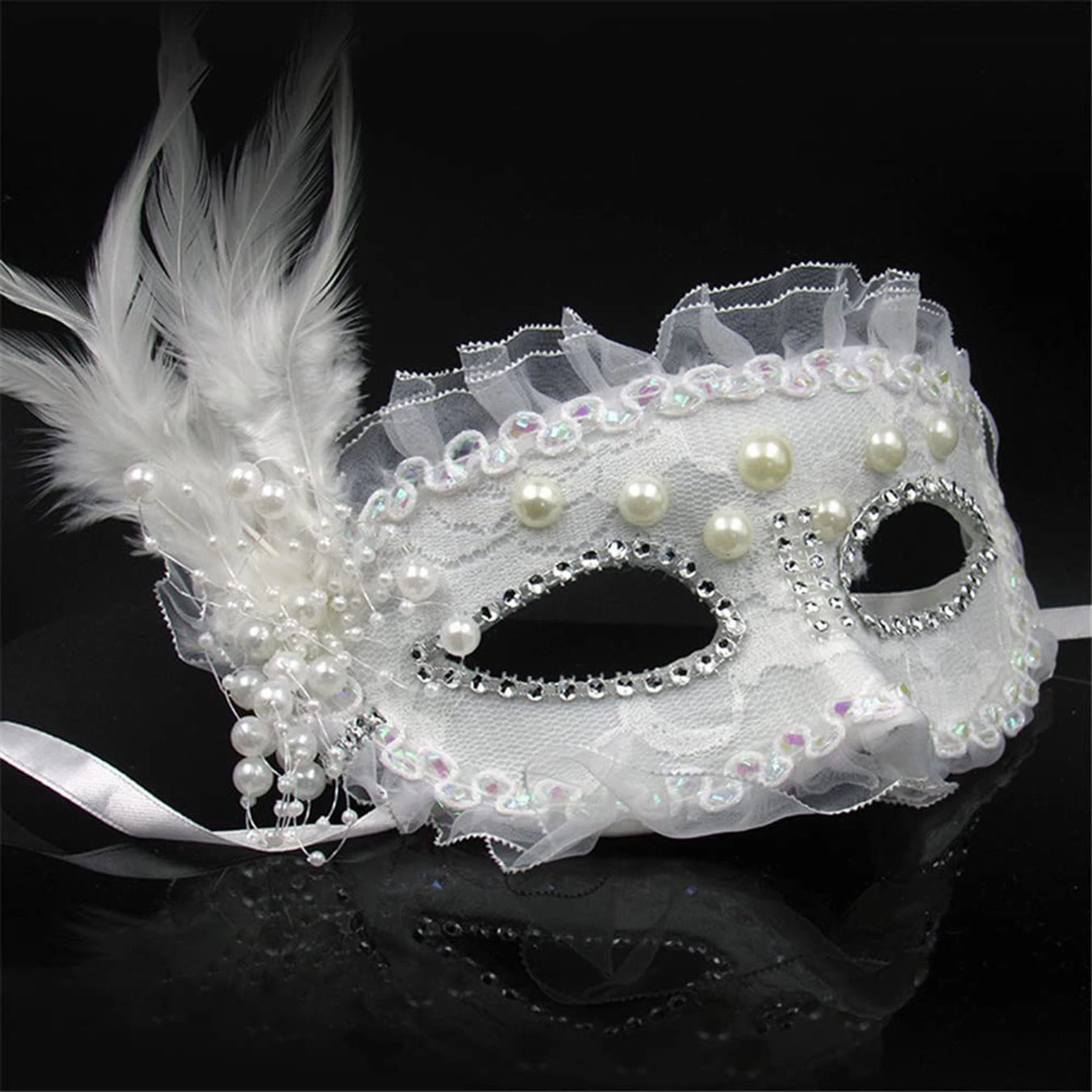 Как использовать белую кружевную маску для вечеринки с перьями по бокам, вышитыми жемчугом и камнями?