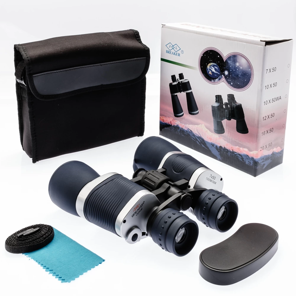 Ручной бинокль Breaker 7x50 с диаметром линзы 50 мм и 7-кратным увеличением позволяет рассматривать объекты на расстоянии 1000 метров с идеальной чёткостью до 56 метров. Диаметр линзы 50 мм обеспечивает широкое изображение и комфортный обзор (чем больше диаметр линзы, тем шире и комфортнее обзор).