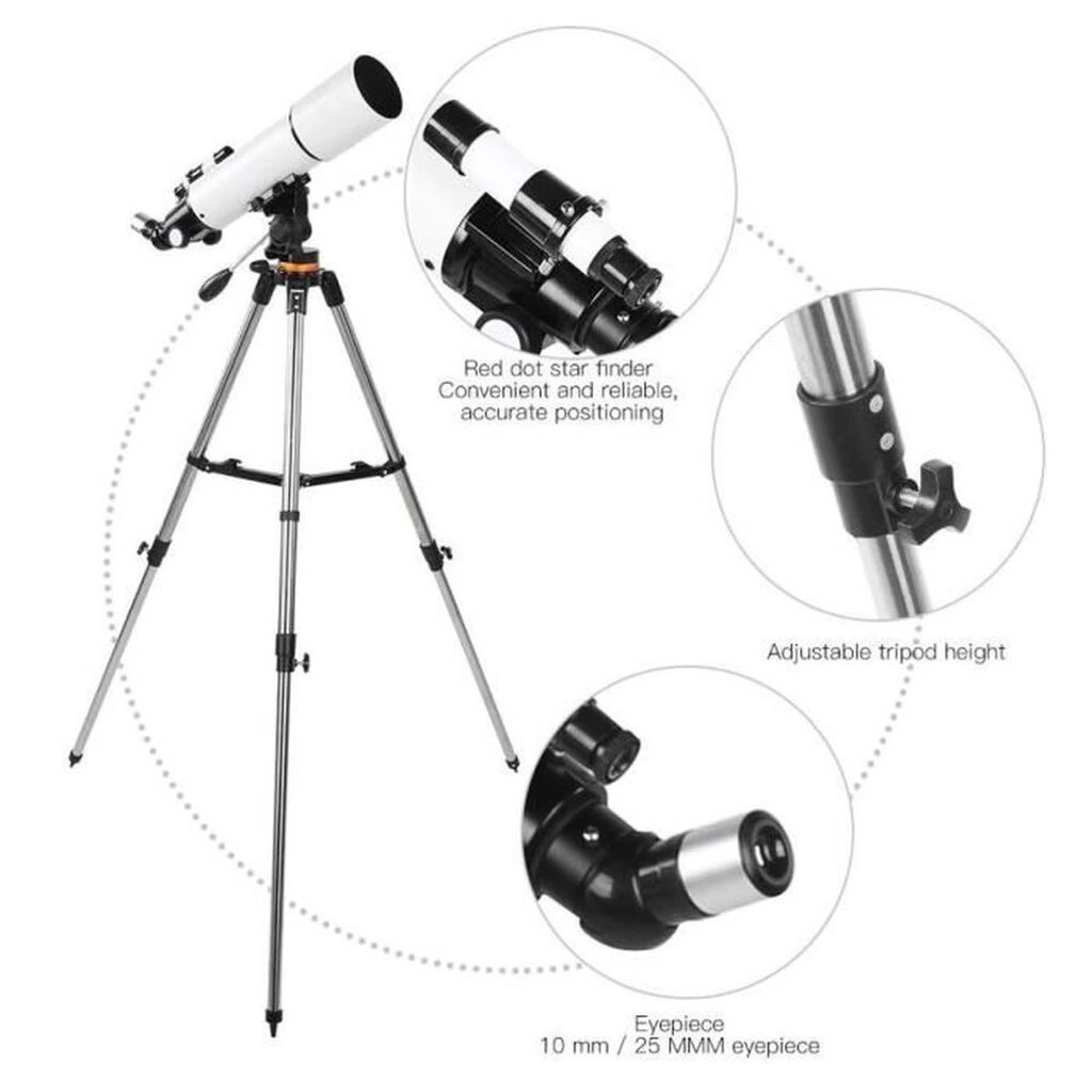 Он подходит как для наблюдения за небом, так и за землей. Другие телескопы на рынке показывают землю перевёрнутой, но только для неба, и для отображения земли в плоском виде требуется адаптер за 100 долларов. Однако этот продукт полностью автономен и также отображает землю в плоском виде. Дополнительный адаптер не требуется. Он изготовлен известным производителем телескопов. Используйте его как телескоп и бинокль с превосходной чёткостью и увеличением. Он поставляется со встроенным компасом, указателем цели, штативом, сумкой для переноски и дополнительными аксессуарами, а также с картой звёздного неба.