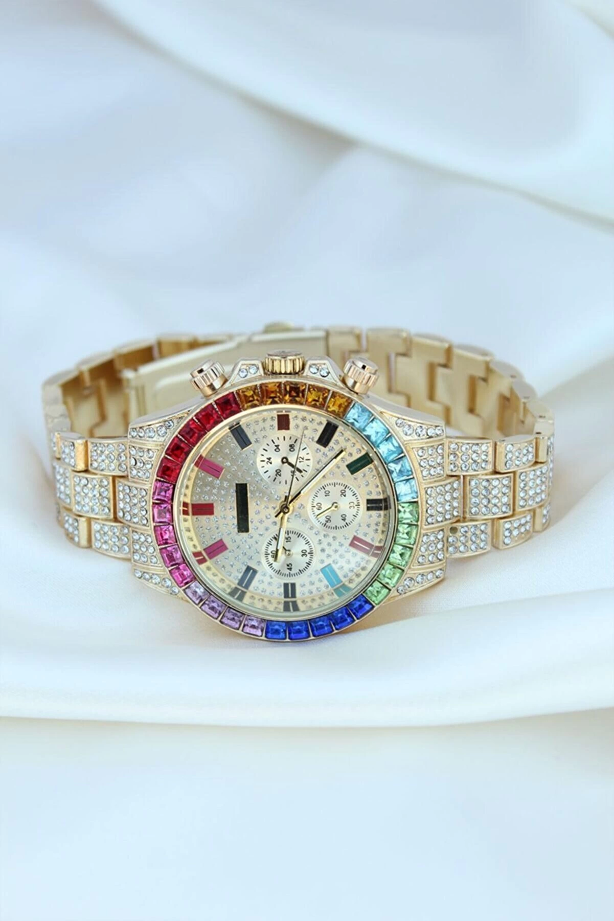 Роскошные женские наручные часы с золотым металлическим ремешком и цветным корпусом с покрытием из циркония