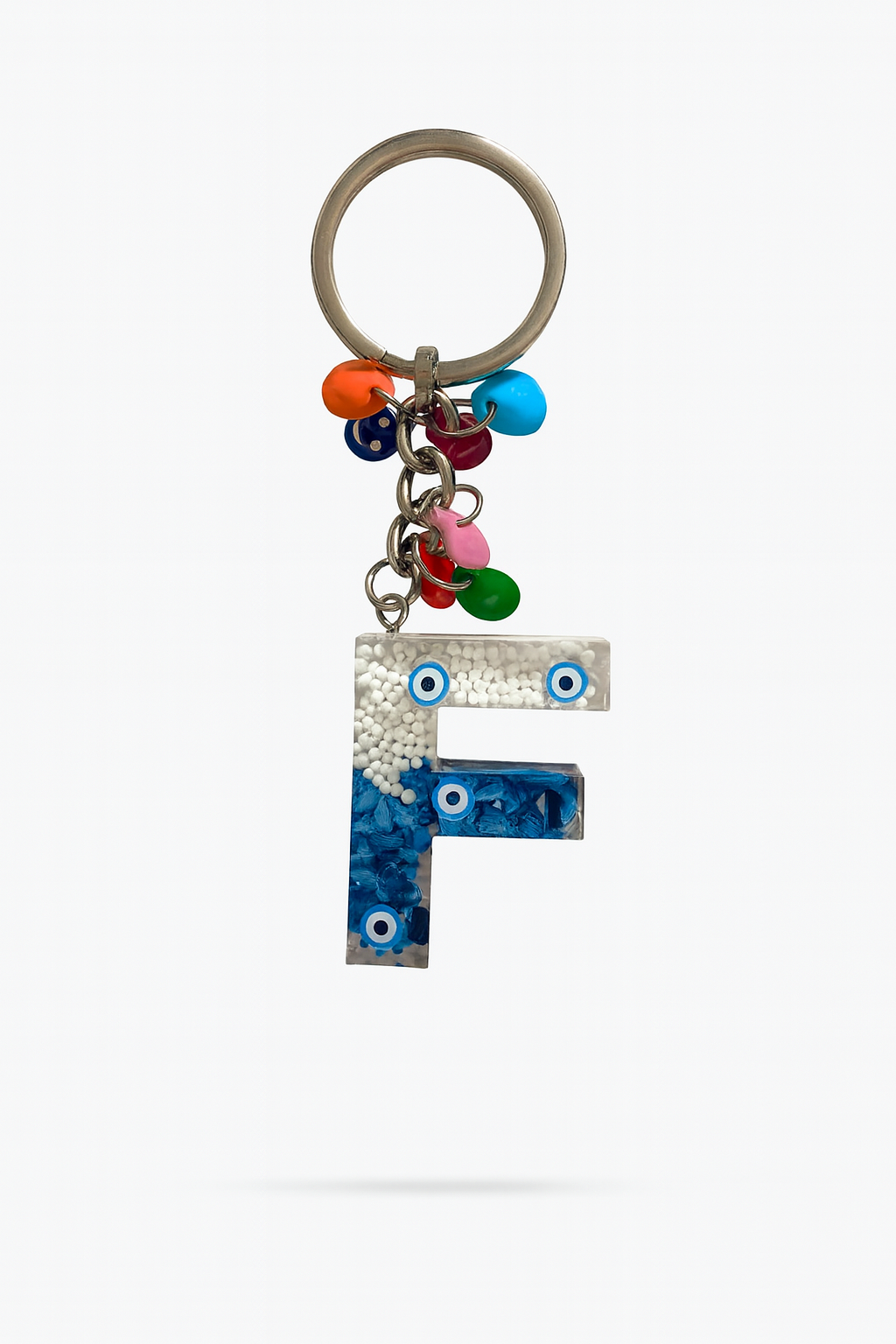 Брелок с буквой из эпоксидной смолы – буква F, бусина от сглаза и красочный амулет