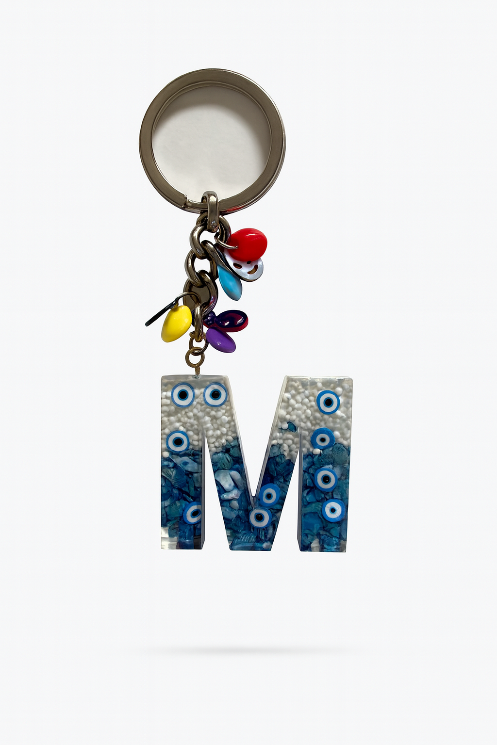 Брелок с буквой из эпоксидной смолы – буква «М», бусина от сглаза и красочный амулет