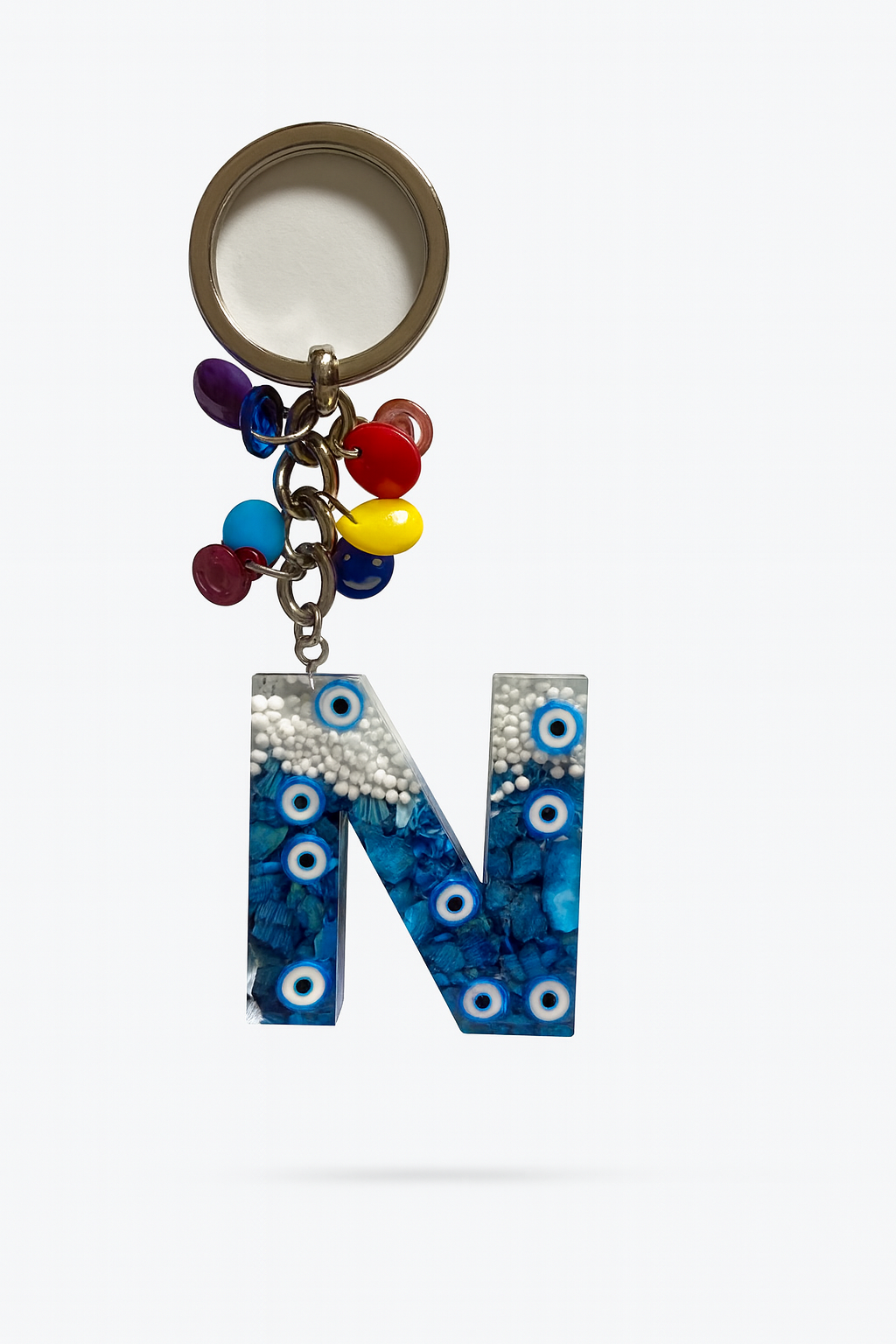 Брелок с буквой из эпоксидной смолы – буква N, бусина от сглаза и красочный амулет