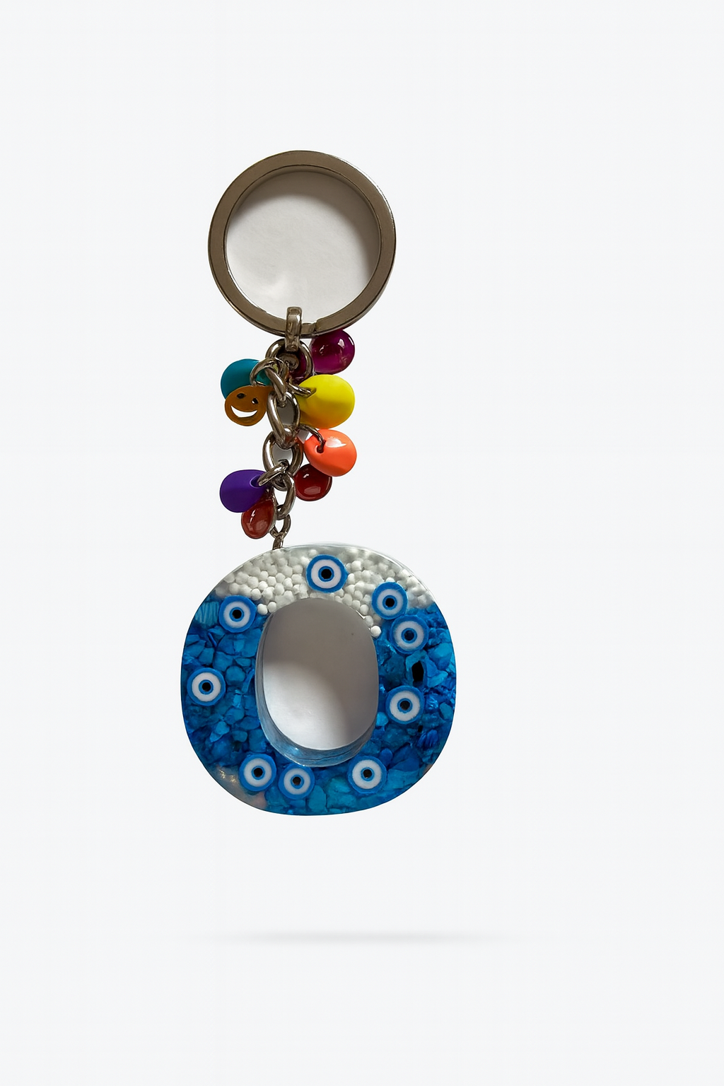 Брелок с буквой из эпоксидной смолы – буква «О», бусина от сглаза и красочный амулет