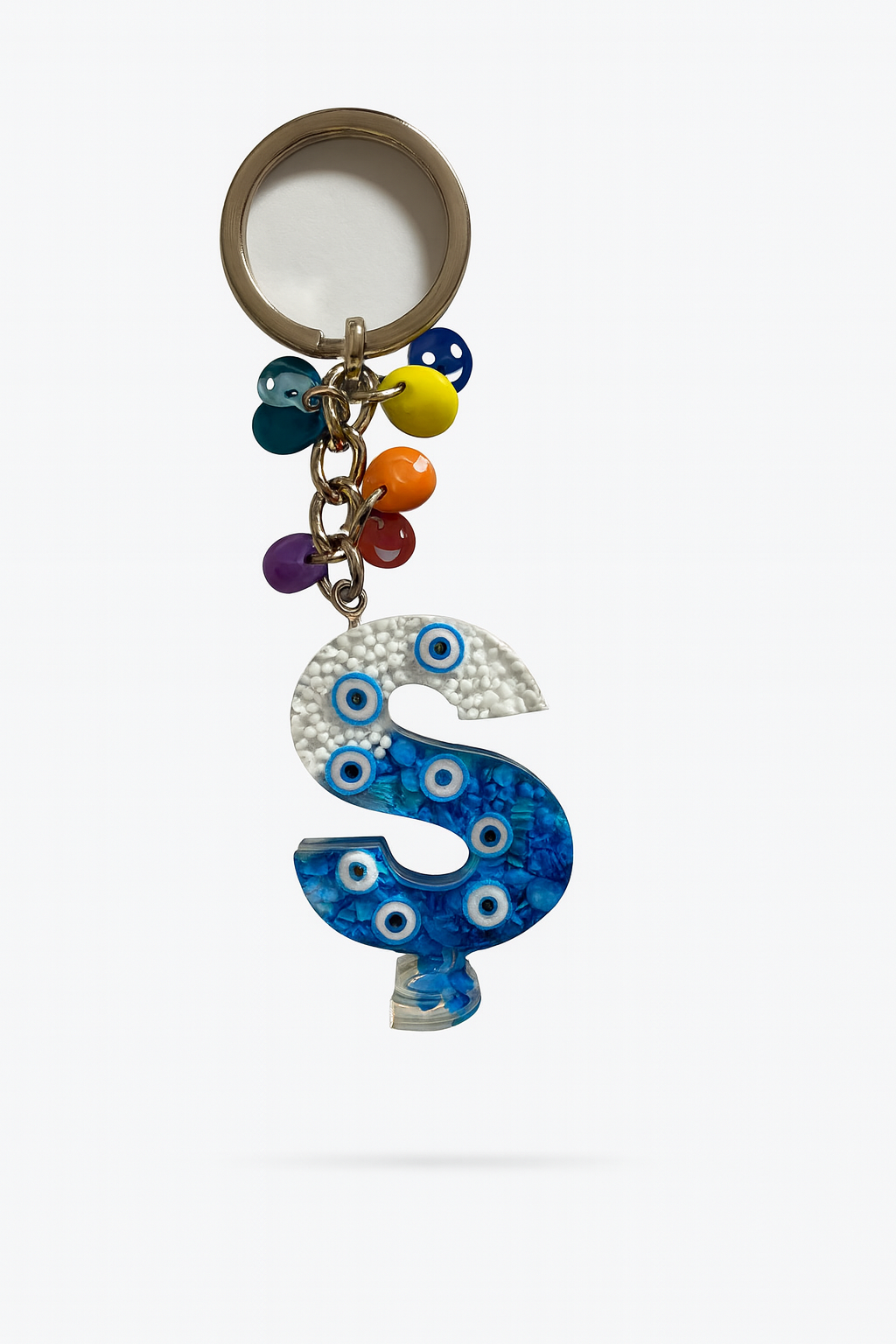Брелок с буквой из эпоксидной смолы – буква S, бусина от сглаза и красочный амулет