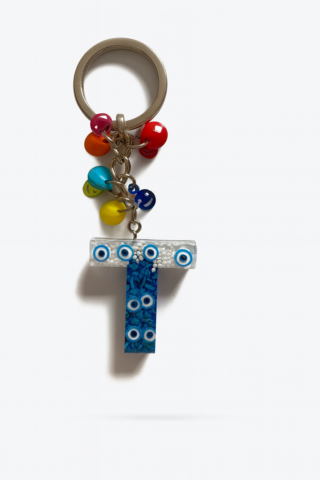 Брелок с буквой из эпоксидной смолы – буква T, бусина от сглаза и красочный амулет