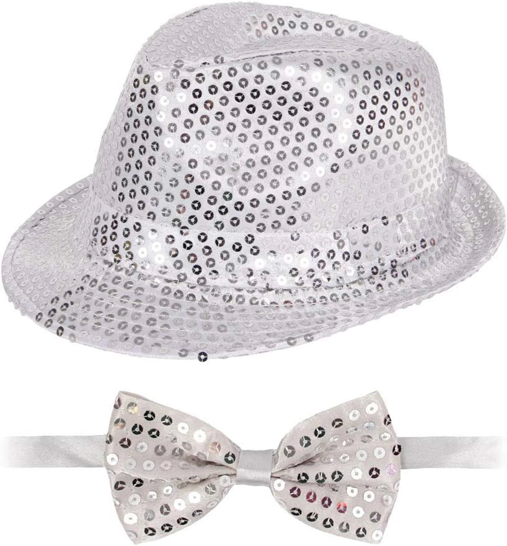 Комплект из серебряной шляпы и галстука-бабочки с пайетками – сверкающий аксессуар для вечеринки