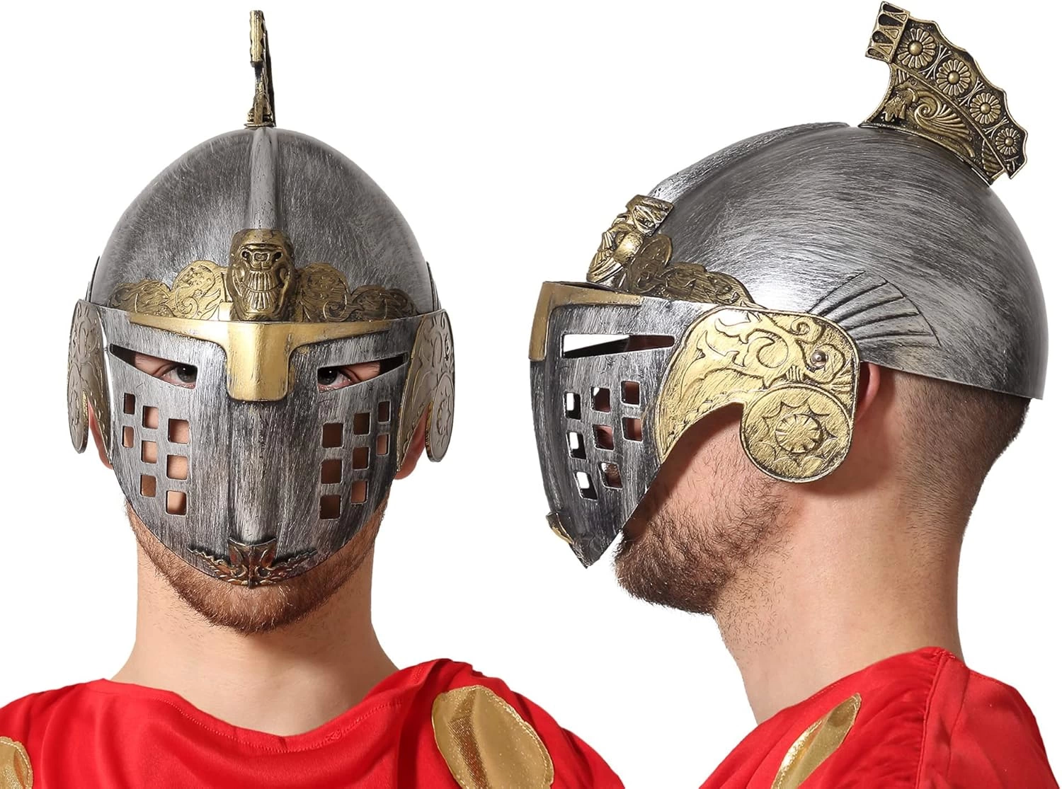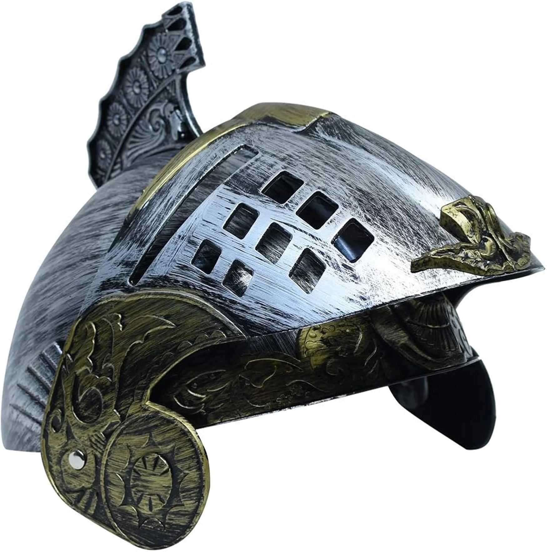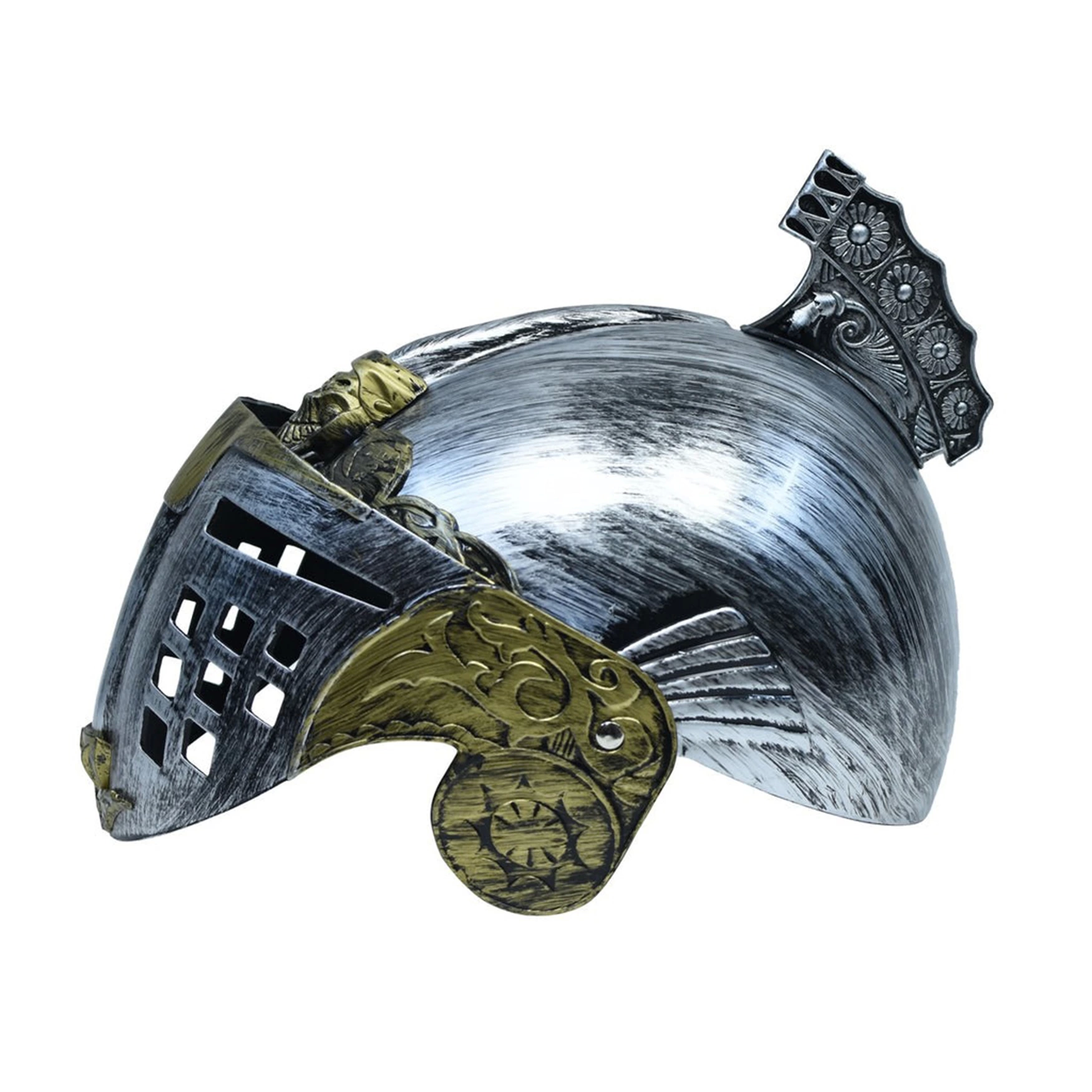 Этот римско-византийский шлем поражает своим серебристо-золотым цветом. Размер шлема составляет 25 х 20 см, он стандартного размера для взрослых и имеет откидывающийся капюшон.
