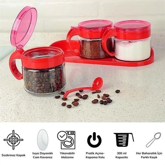 Набор из 3 стеклянных герметичных банок для специй красного цвета с подставкой, крышкой и ложкой KC-386
