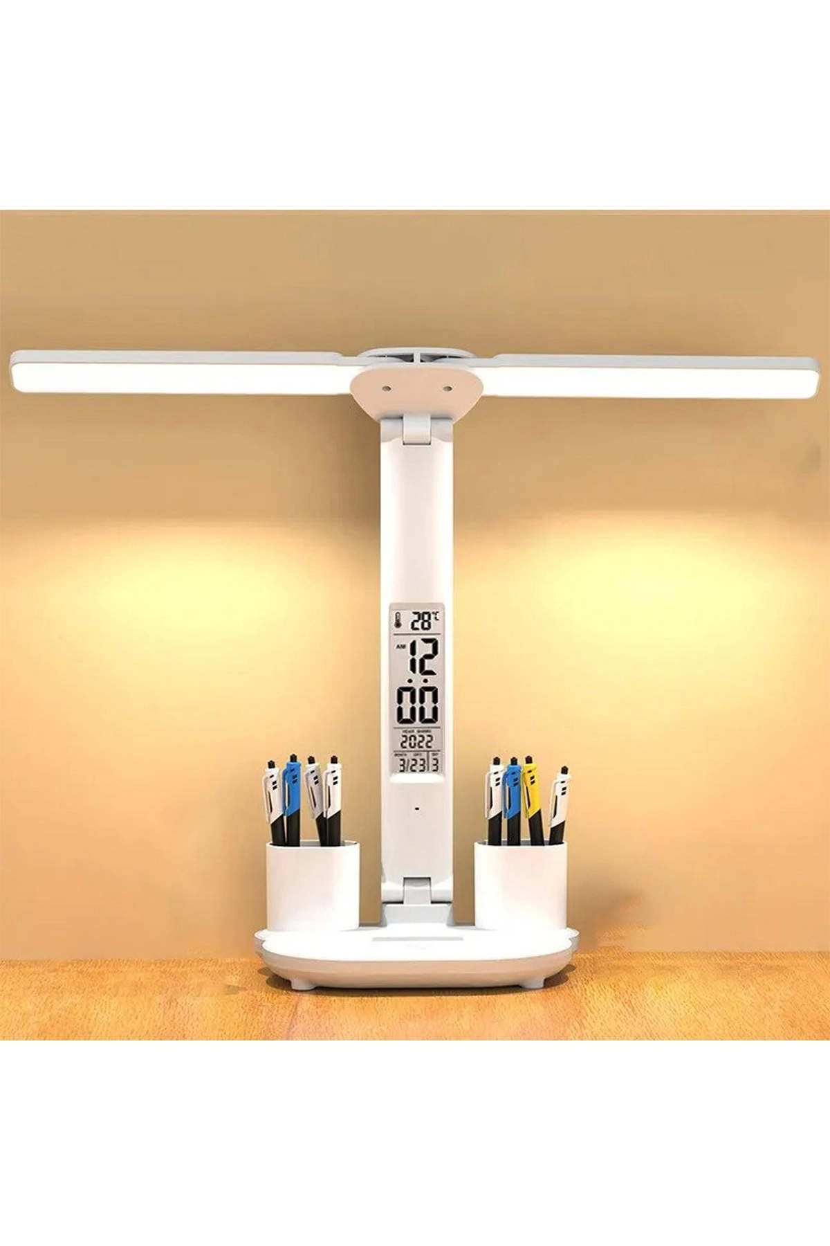 Многофункциональная перезаряжаемая настольная лампа 5-в-1 + часы + термометр + календарь + держатель для ручек + держатель для телефона