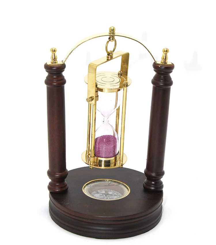 Песочные часы с циркулем из латуни, артикул 5053. Дно и боковины изготовлены из дерева, остальные детали – из латуни. Размеры изделия: 22*13 см.