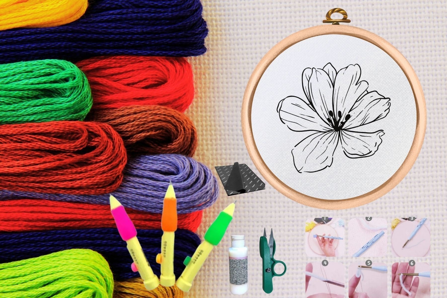 Этот набор для вышивания предлагает полный стартовый комплект для тех, кто хочет научиться или продолжить заниматься вышивкой иглой. В набор входят следующие материалы: 3 иглы для иглопробивания: три иглы разной толщины подходят для различных типов ниток и узоров. Иглы позволяют практиковать различные техники вышивания, от мелких деталей до заполнения больших площадей. Ткань: ткань, специально предназначенная для иглопробивания, выбирается так, чтобы игла легко проникала и четко проявляла рисунок. Обычно предпочтительны хлопок или лен. Пяльцы: пяльцы, которые надежно удерживают ткань, предотвращая ее соскальзывание во время вышивания и облегчая вашу работу. Они могут быть сделаны из дерева или пластика. Клей для иглопробивания: клей для иглопробивания используется для фиксации ниток и узора после завершения вышивки. Этот клей предотвращает ослабление ниток со временем. Ножницы для ниток: острые ножницы для ниток позволяют точно обрезать нитки. Они небольшие и эргономичные, что делает их простыми в использовании во время вышивания. Изображение для иглопробивания: рисунок для иглопробивания, который можно использовать в качестве руководства. Эта схема вдохновит вас и предлагает схемы разной сложности: от начального до продвинутого уровня. В этот набор входят все необходимые материалы, чтобы начать работать с вышивкой пуансоном или улучшить уже имеющиеся проекты. Вышивка пуансоном — это одновременно расслабляющее и творческое занятие, и этот набор поможет вам легко освоить её и практиковаться.