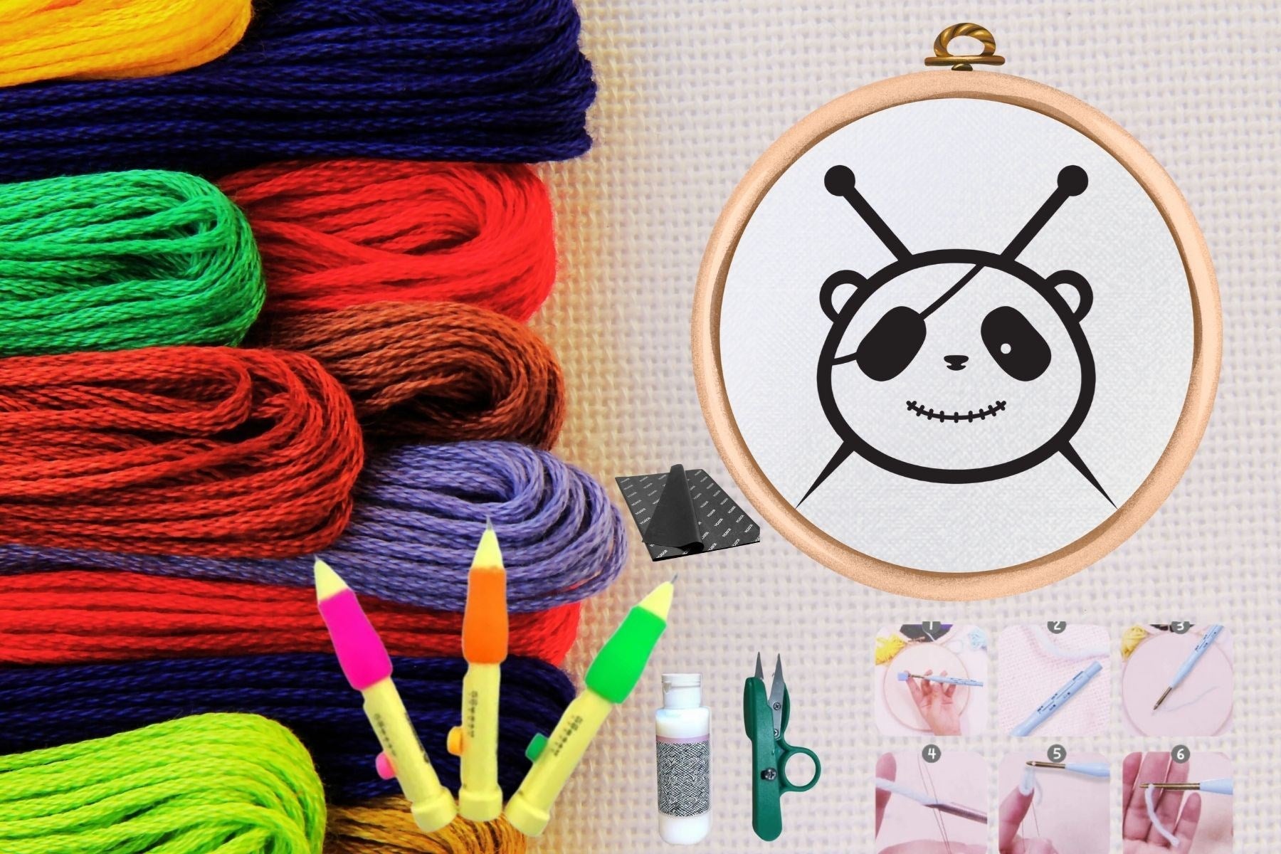Этот набор для вышивания предлагает полный стартовый комплект для тех, кто хочет научиться или продолжить заниматься вышивкой иглой. В набор входят следующие материалы: 3 иглы для иглопробивания: три иглы разной толщины подходят для различных типов ниток и узоров. Иглы позволяют практиковать различные техники вышивания, от мелких деталей до заполнения больших площадей. Ткань: ткань, специально предназначенная для иглопробивания, выбирается так, чтобы игла легко проникала и четко проявляла рисунок. Обычно предпочтительны хлопок или лен. Пяльцы: пяльцы, которые надежно удерживают ткань, предотвращая ее соскальзывание во время вышивания и облегчая вашу работу. Они могут быть сделаны из дерева или пластика. Клей для иглопробивания: клей для иглопробивания используется для фиксации ниток и узора после завершения вышивки. Этот клей предотвращает ослабление ниток со временем. Ножницы для ниток: острые ножницы для ниток позволяют точно обрезать нитки. Они небольшие и эргономичные, что делает их простыми в использовании во время вышивания. Изображение для иглопробивания: рисунок для иглопробивания, который можно использовать в качестве руководства. Эта схема вдохновит вас и предлагает схемы разной сложности: от начального до продвинутого уровня. В этот набор входят все необходимые материалы, чтобы начать работать с вышивкой пуансоном или улучшить уже имеющиеся проекты. Вышивка пуансоном — это одновременно расслабляющее и творческое занятие, и этот набор поможет вам легко освоить её и практиковаться.
