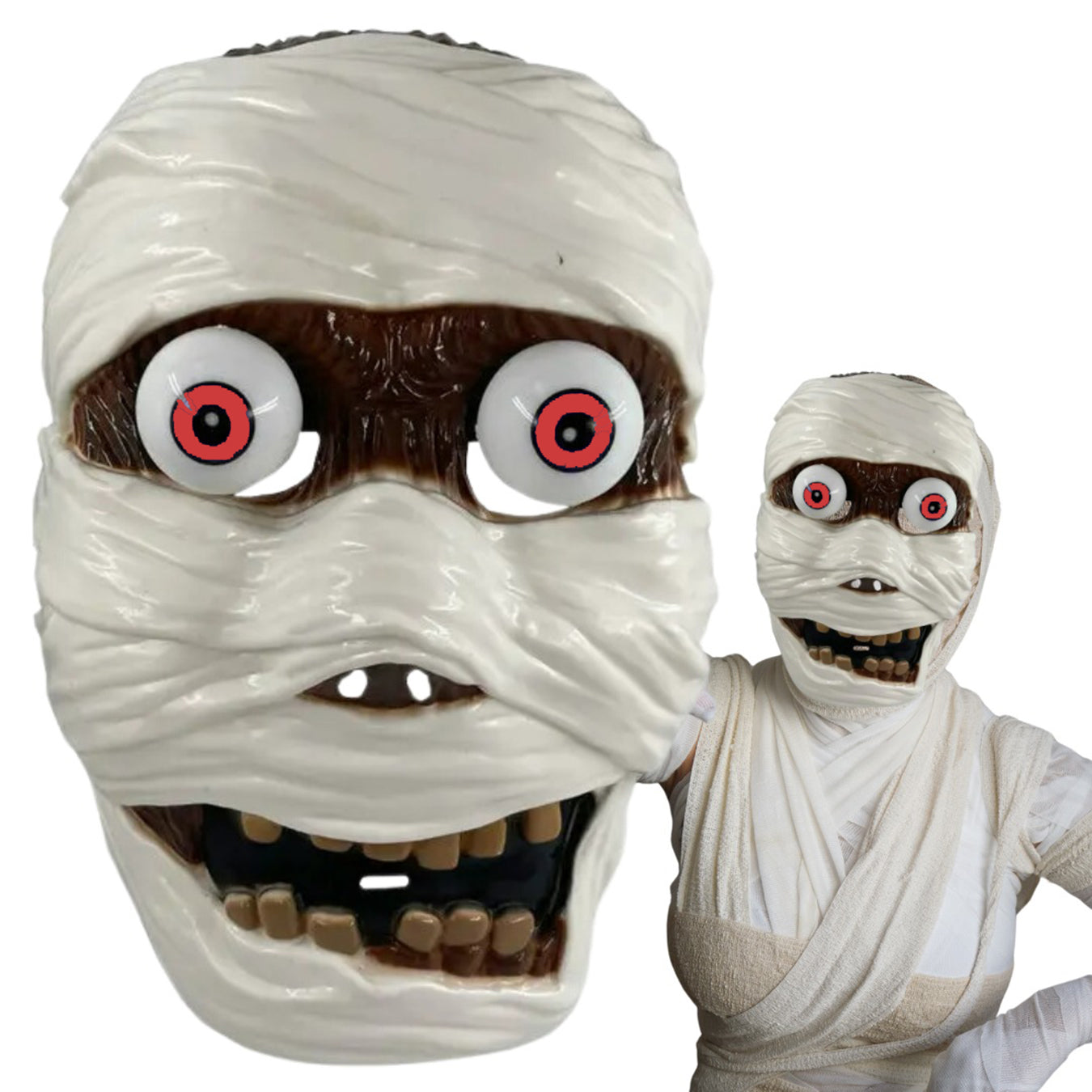 Ищете пугающий, но весёлый аксессуар? Маска мумии с игрушечными глазами и пружинами — идеальный выбор! Эта маска не только создаст эффектный образ, но и рассмешит всех своими движущимися глазами. Идеально подходит для тематических вечеринок или особых случаев!
