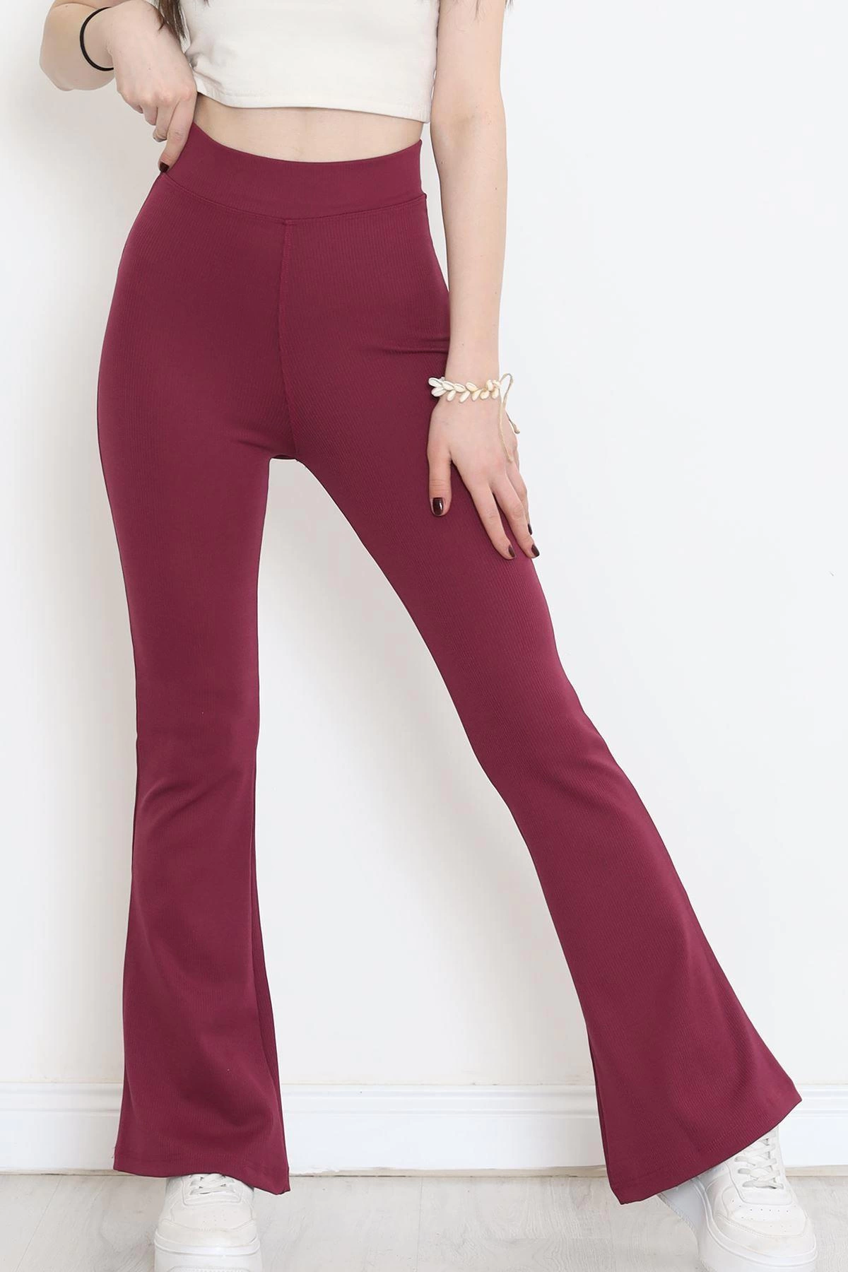 Şık Ve Rahat Yüksek Bel İspanyol Paça Fitilli Toparlayıcı Mürdüm Tayt