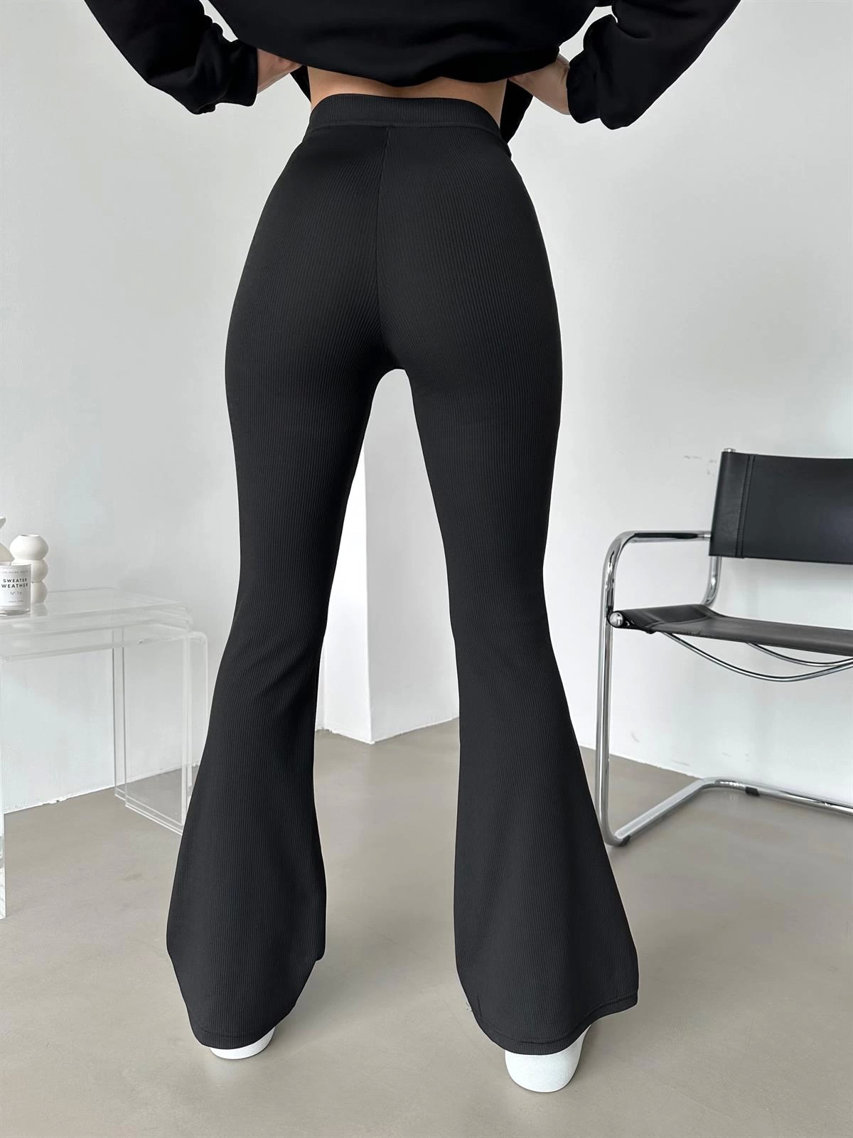Стильные и удобные расклешенные черные леггинсы в рубчик с высокой талией