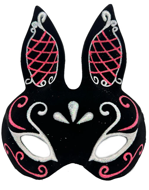 Маска кролика из черной замши с красными и белыми блестками