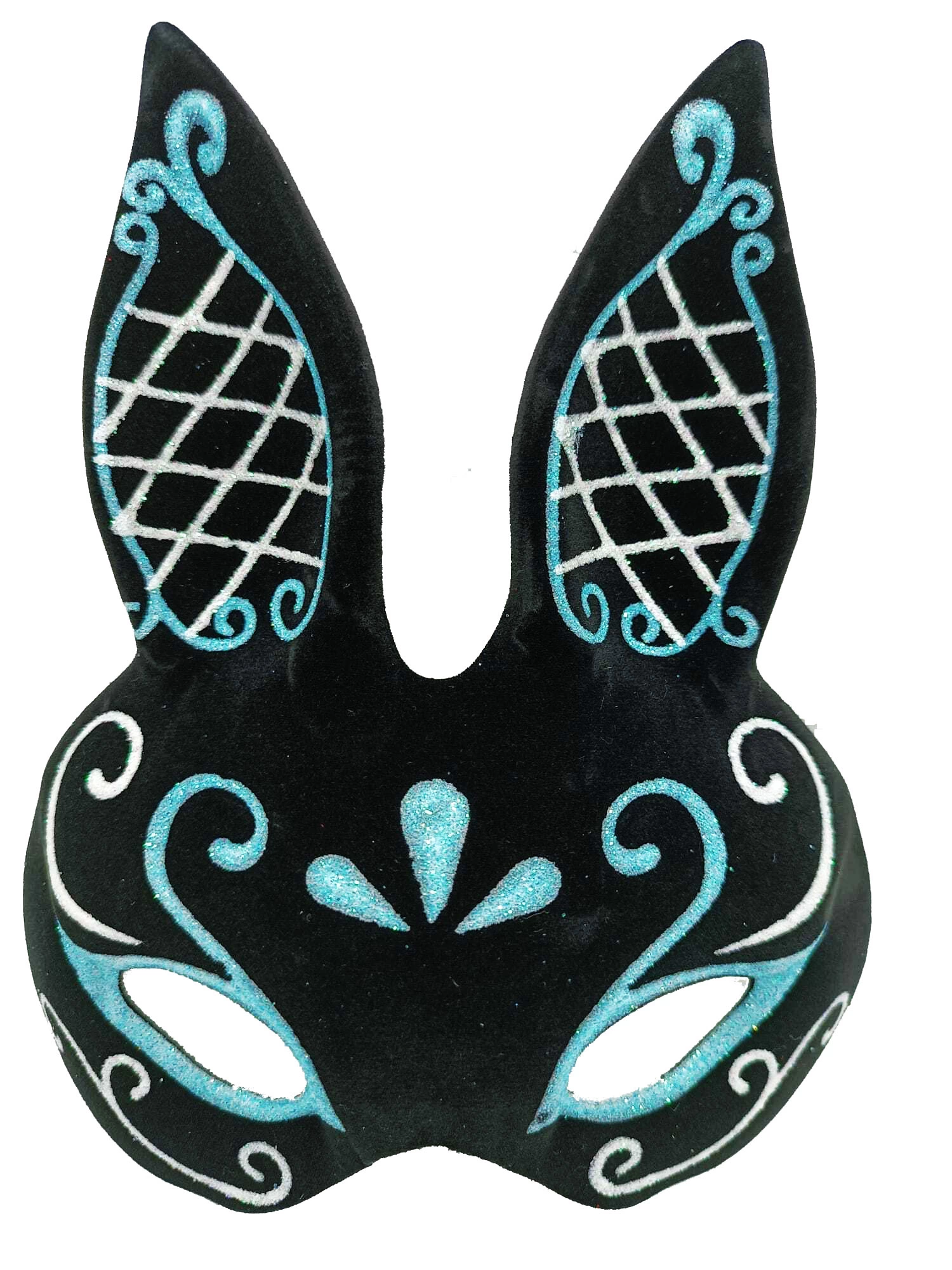 Для создания таинственного и завораживающего образа вам идеально подойдет наша черная замшевая маска кролика с синими и белыми блестками.
