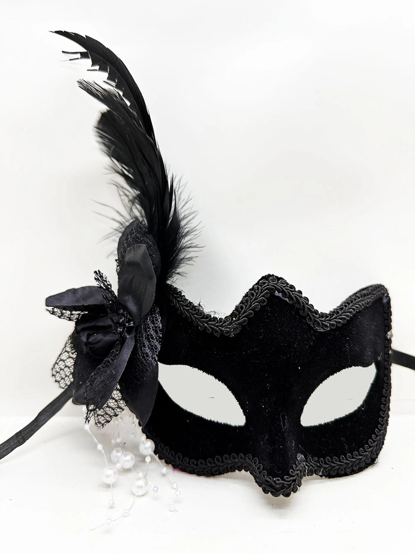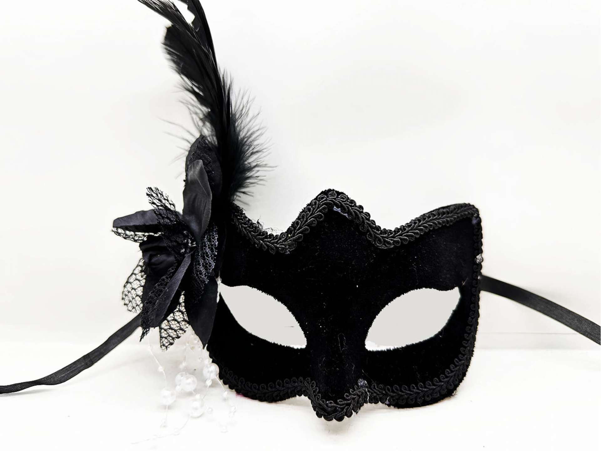 Почему вам стоит выбрать черную замшевую маску для вечеринки с перьями по бокам и белым жемчугом?