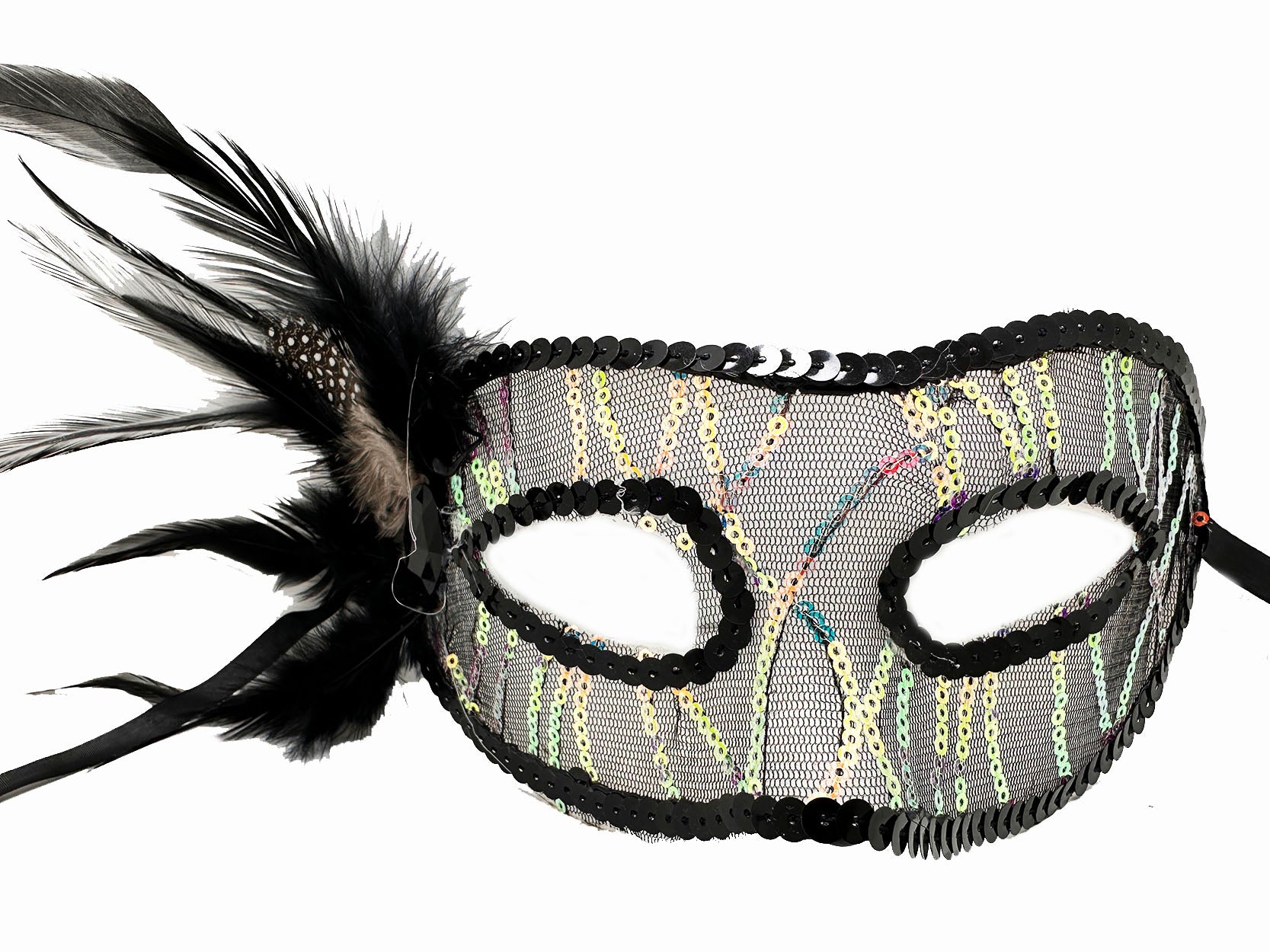 Почему вам стоит выбрать черную маску для вечеринки, расшитую пайетками и украшенную перьями по бокам?