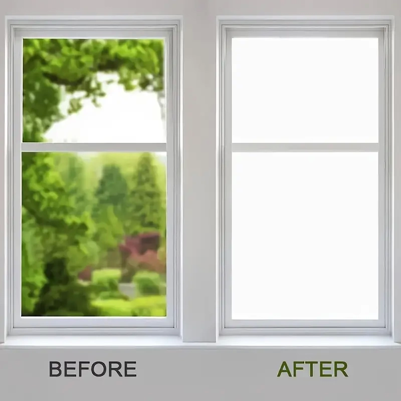Матовую оконную пленку, блокирующую УФ-излучение, можно использовать на окнах, стеклянных дверях или стенах в домах для обеспечения конфиденциальности и снижения вредного воздействия солнечных лучей.