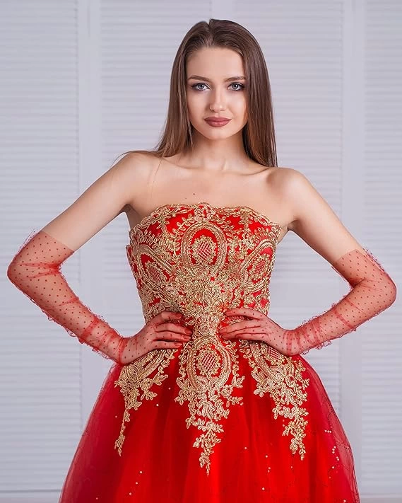 Длинные перчатки для взрослых из тюля красного цвета в горошек, 55 см